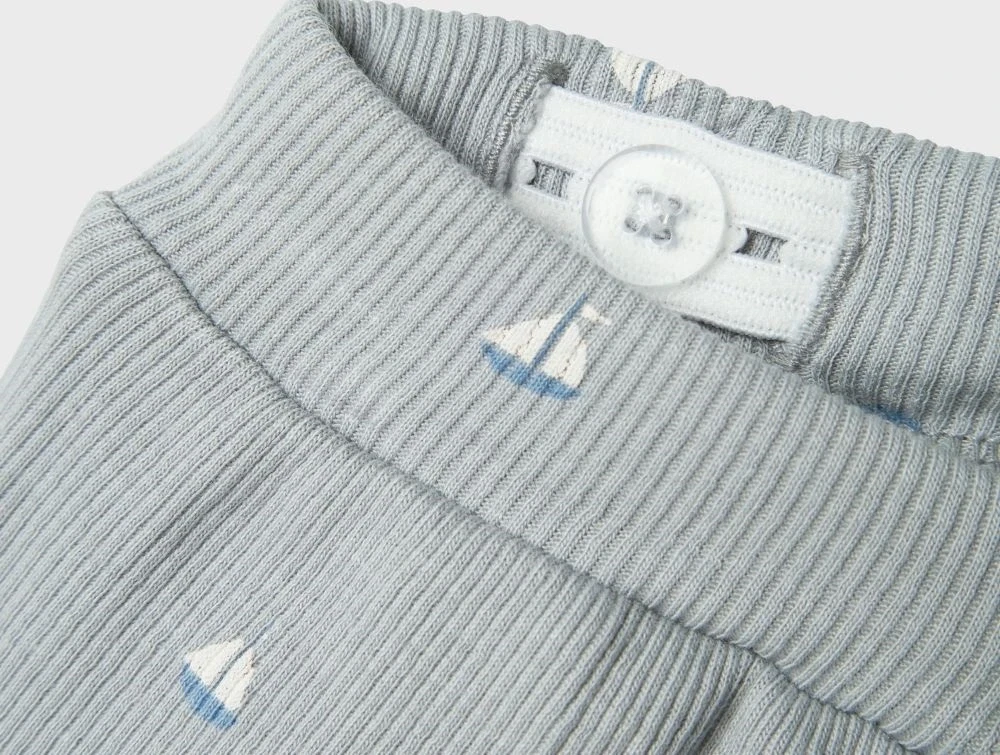 Bløde bukser i blå (quarry) fra Name It med print af både over hele stoffet.