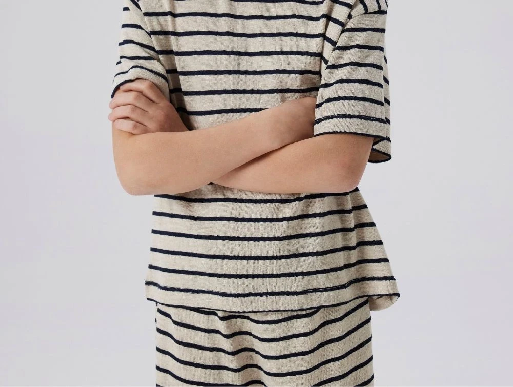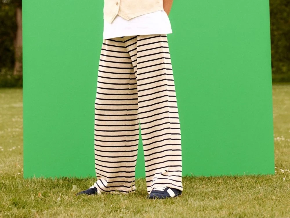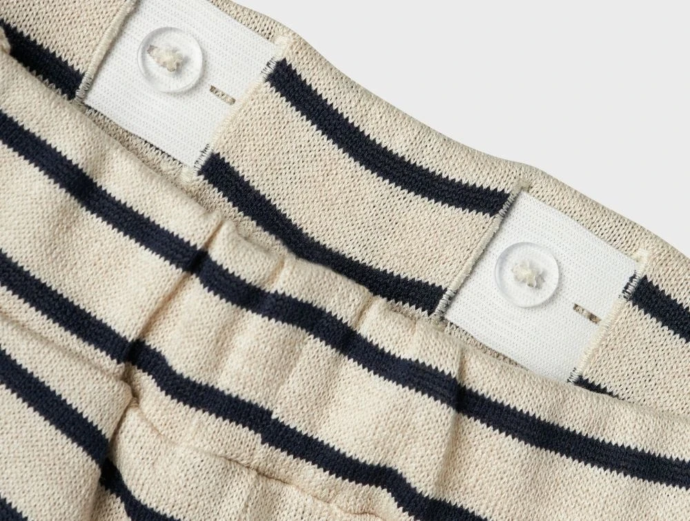 Lette og luftige bukser fra Name It med brede ben og et klassisk stribemønster i sommer sand og navy blazer. Bukserne er lavet af blød viskose, der giver en let og behagelig pasform.