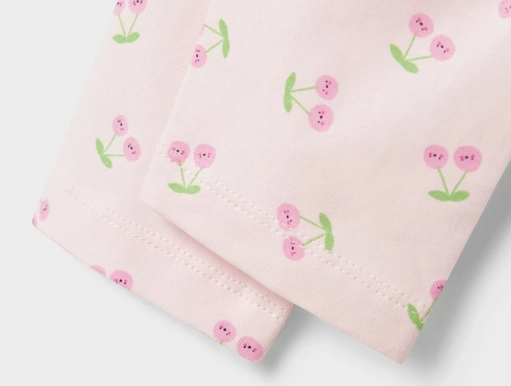 Capri leggings i en smuk lyserød nuance med print af små pink kirsebær med ansigter. Leggingsene har en kort længde lige under knæet, der gør dem ideelle under kjoler og nederdele eller som et let valg på varme dage.