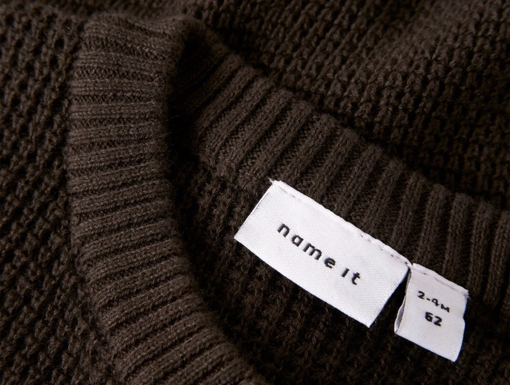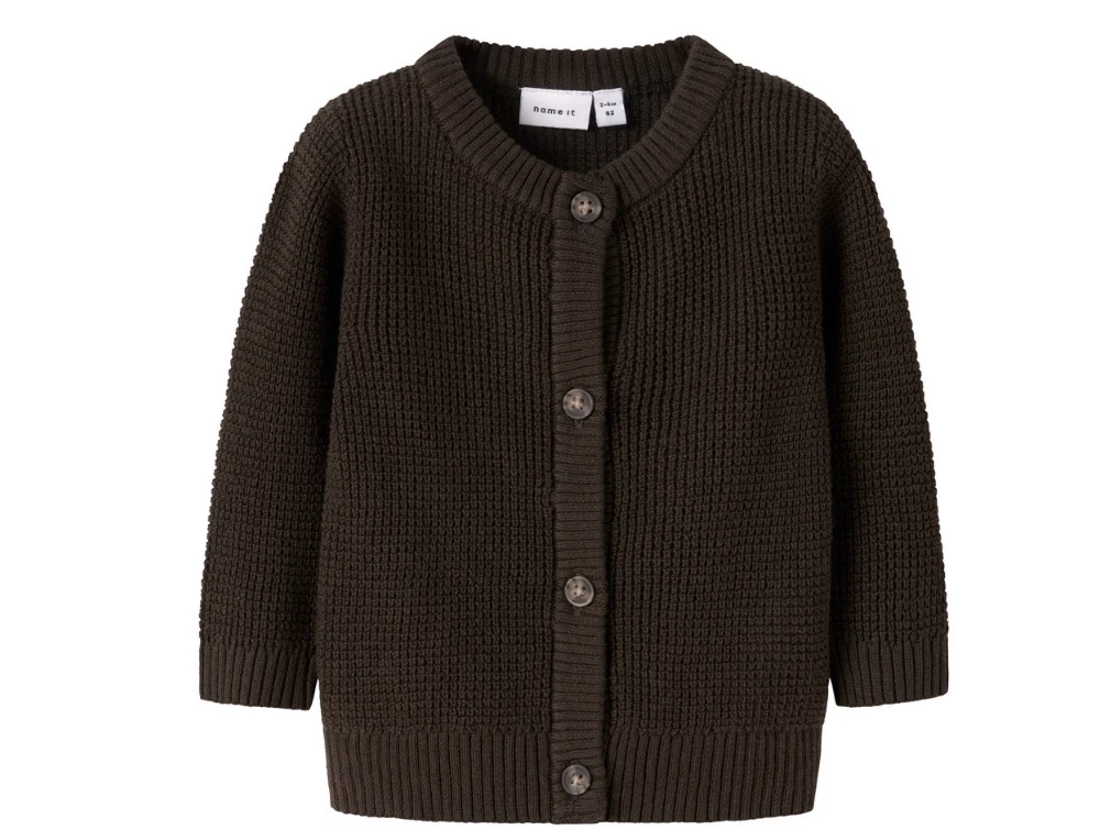 Cardigan i mørkebrun nuance fra Name It. Den er strikket i en blød vaffelstruktur, som giver et flot og levende udtryk. Fremstillet i 100% økologisk bomuld, der føles behagelig mod huden.