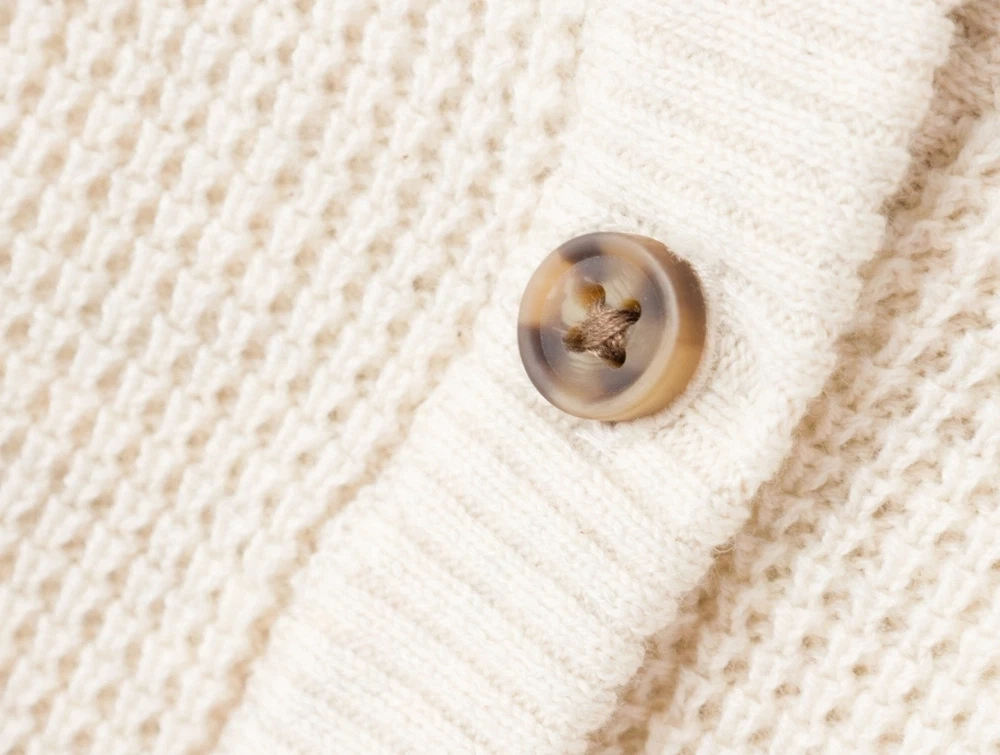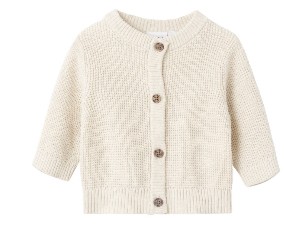 Cardigan i råhvid nuance fra Name It. Strikket i en blød vaffelstruktur, der giver et flot og klassisk udtryk. Fremstillet i 100% økologisk bomuld, som føles behagelig mod huden og er perfekt til babyens hverdag.
