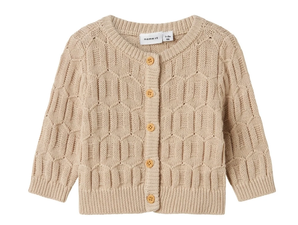 Cardigan i beige nuance fra Name It med flot strukturstrik, der giver et blødt og moderne udtryk. Fremstillet i en blanding af økologisk og genanvendt bomuld, som føles behagelig mod huden.