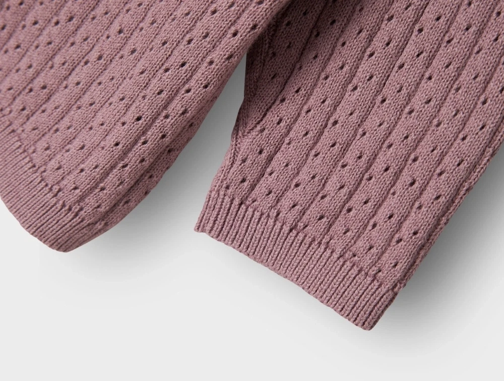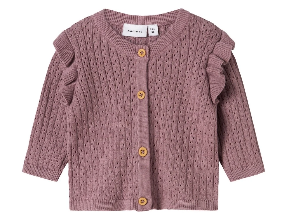 Cardigan i rosa nuance (toadstool) fra Name It med fine flæsedetaljer på skuldrene.