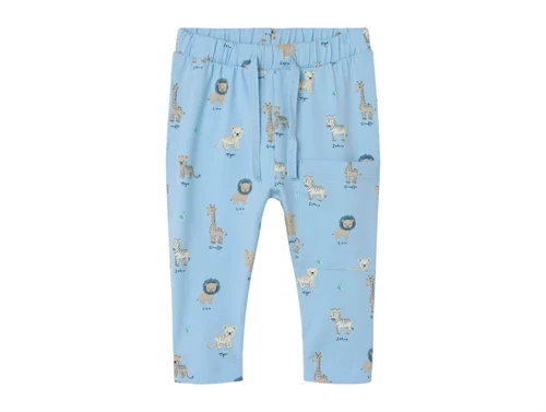 Bløde bukser i farven chambray blue med lomme med dyreprint fra Name It.