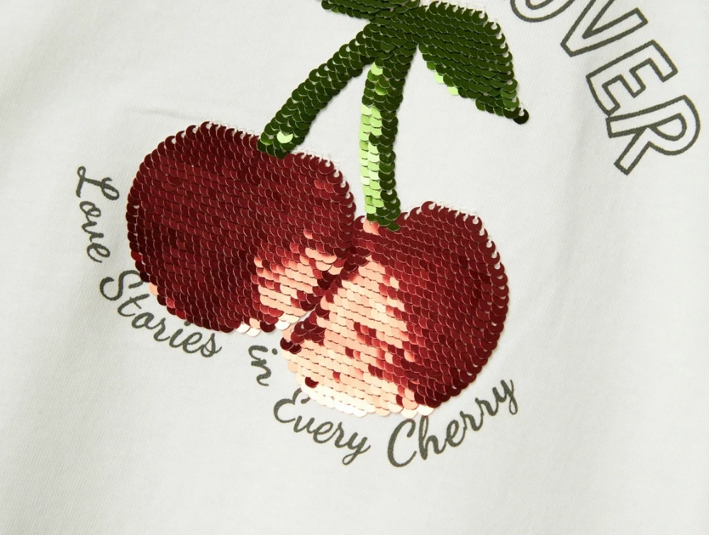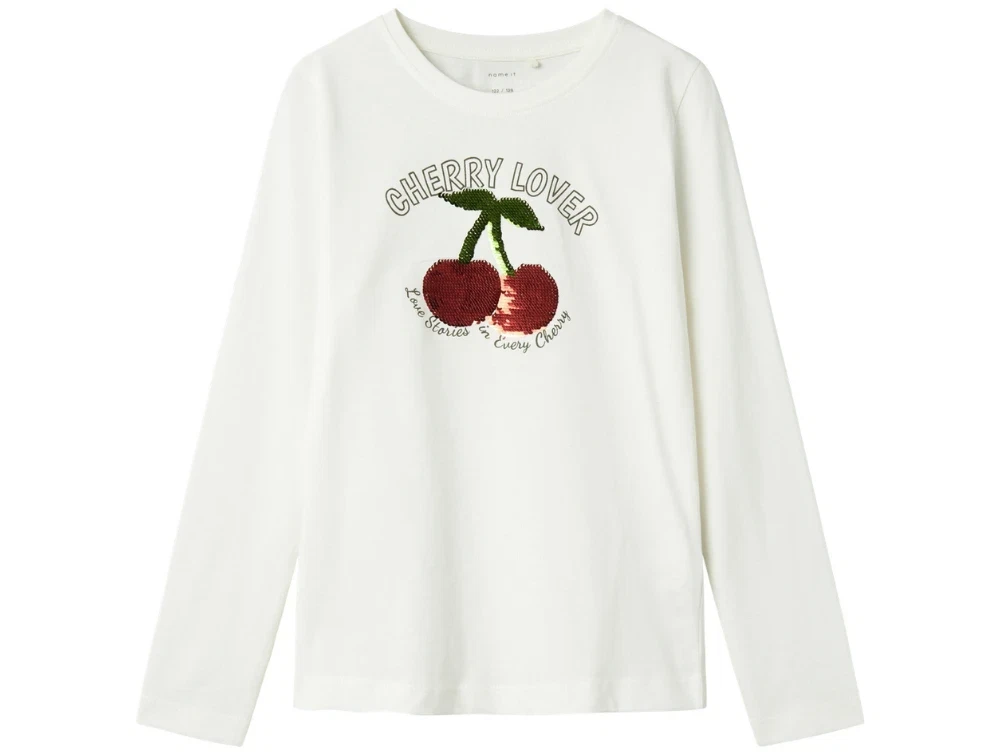 Langærmet top i farven cloud dancer med kirsebær i pailletter fra Name It.
