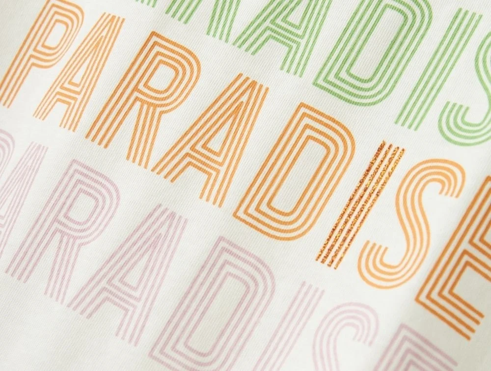 T-shirten er lavet i blød jerseykvalitet af 100% økologisk bomuld. Den har rund hals, korte ærmer og en løs pasform, som giver god komfort og et afslappet udtryk. Tekstprintet er lavet med pigmenttryk, der giver en blød finish.