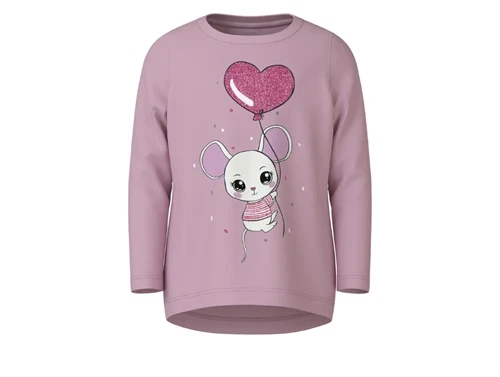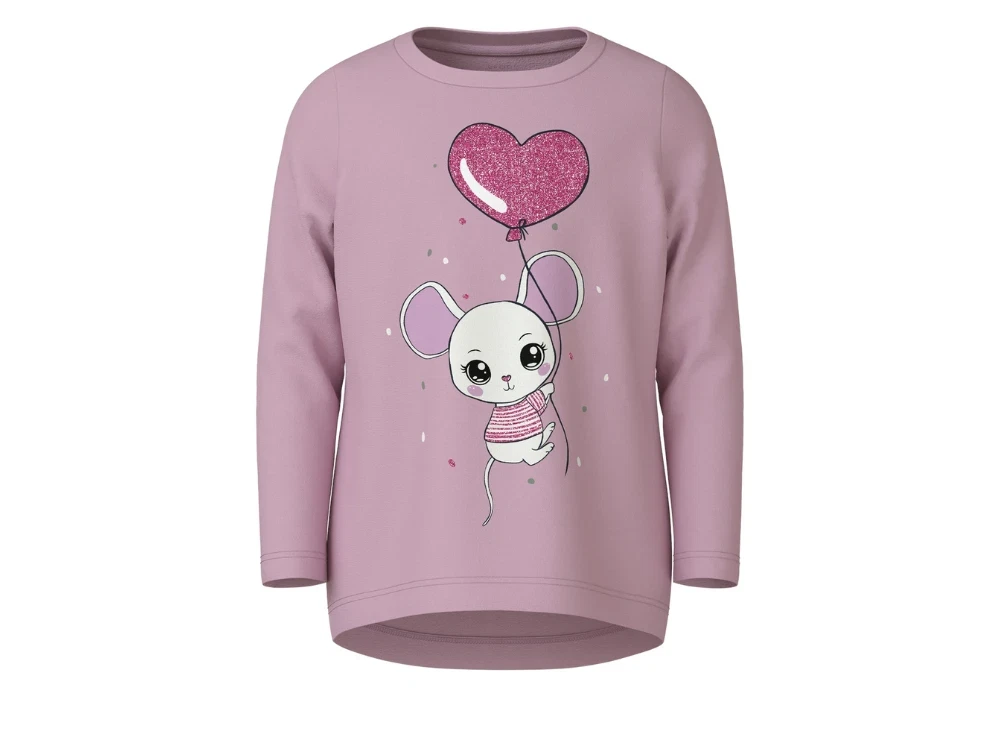 Langærmet top i farven corsage med print af mus med hjerteballon og glimmer fra Name It.