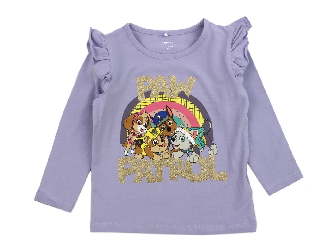 Langærmet t-shirt i farven cosmic sky med Paw Patrol-print, flæser og glimmer fra Name It.