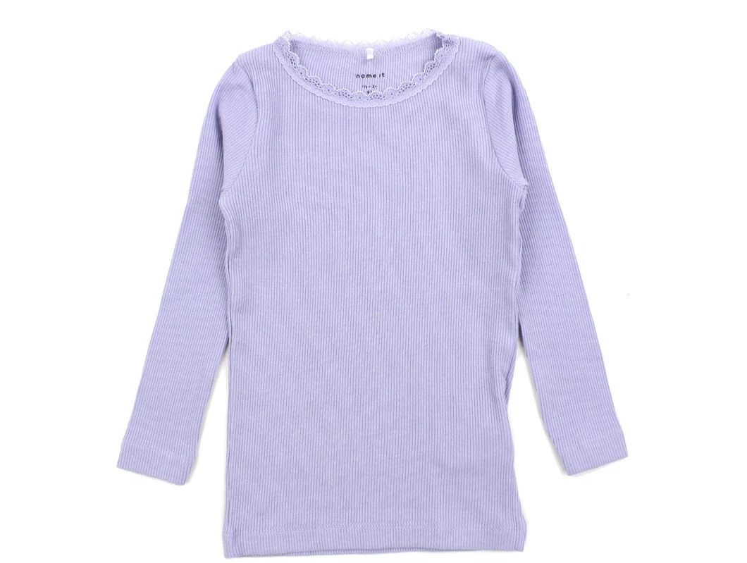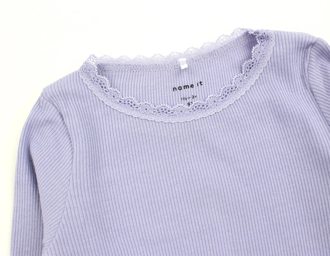 Langærmet top i farven cosmic sky med blonde ved halsåbning fra Name It.
