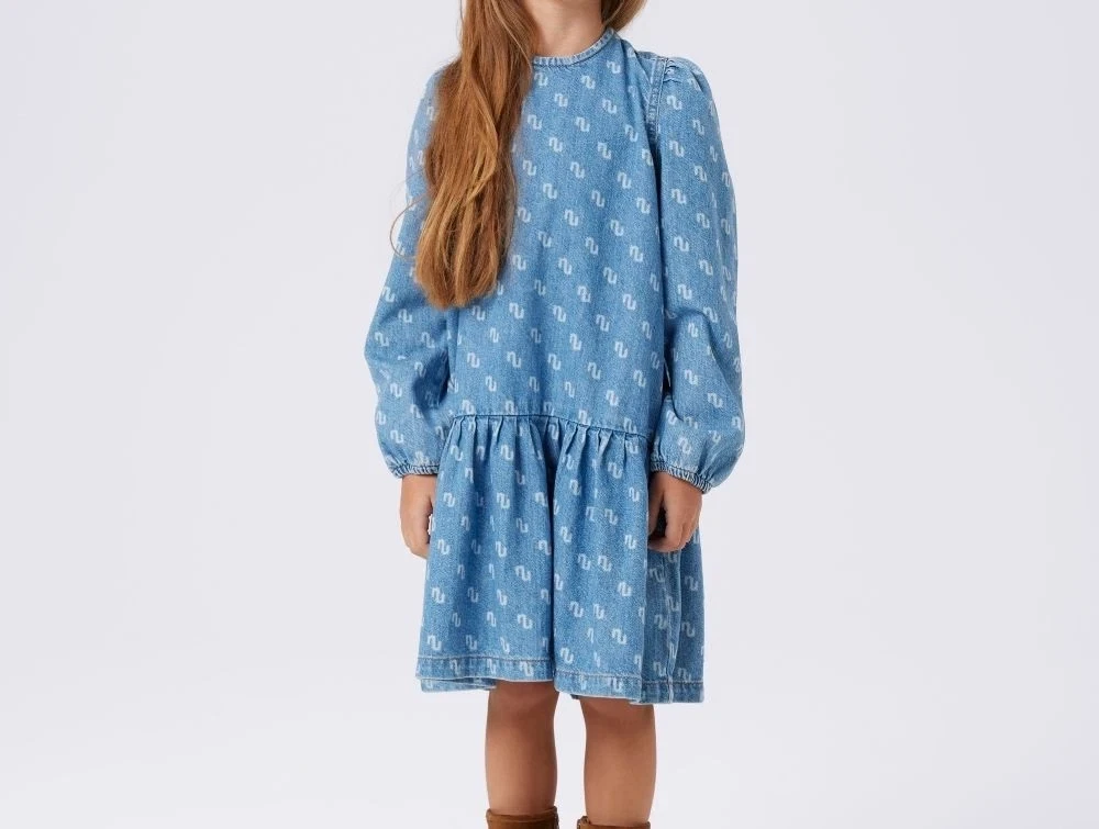 Kjolen har lange ærmer, gennemgående knaplukning med løkke foran og en afslappet pasform med lav talje. Stoffet er vævet denim med et gennemgående print, der giver kjolen et unikt og moderne udtryk.