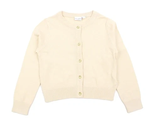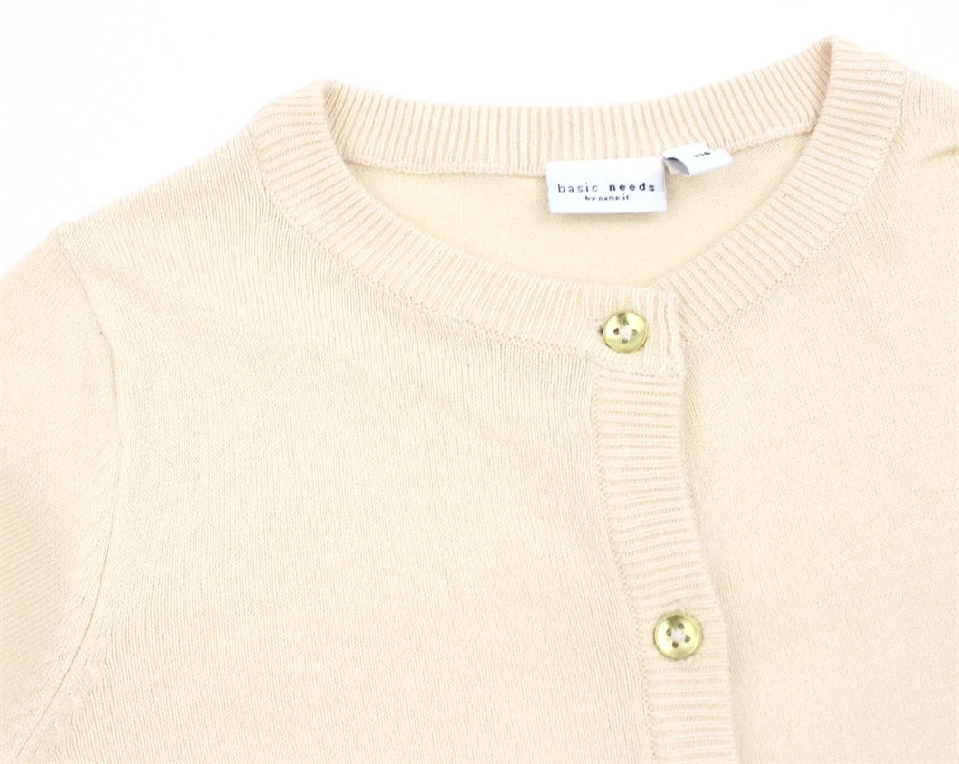 Kort strik cardigan i farven creme de péche med guldknapper fra Name It.