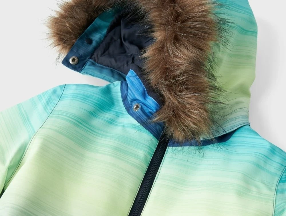 Flyverdragt i farven/printet dark denim flow fra Name It. Flyverdragten har en aftagelig hætte med faux fur og trykknapper.