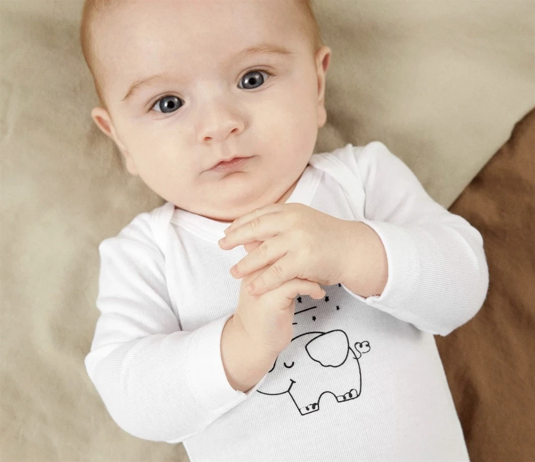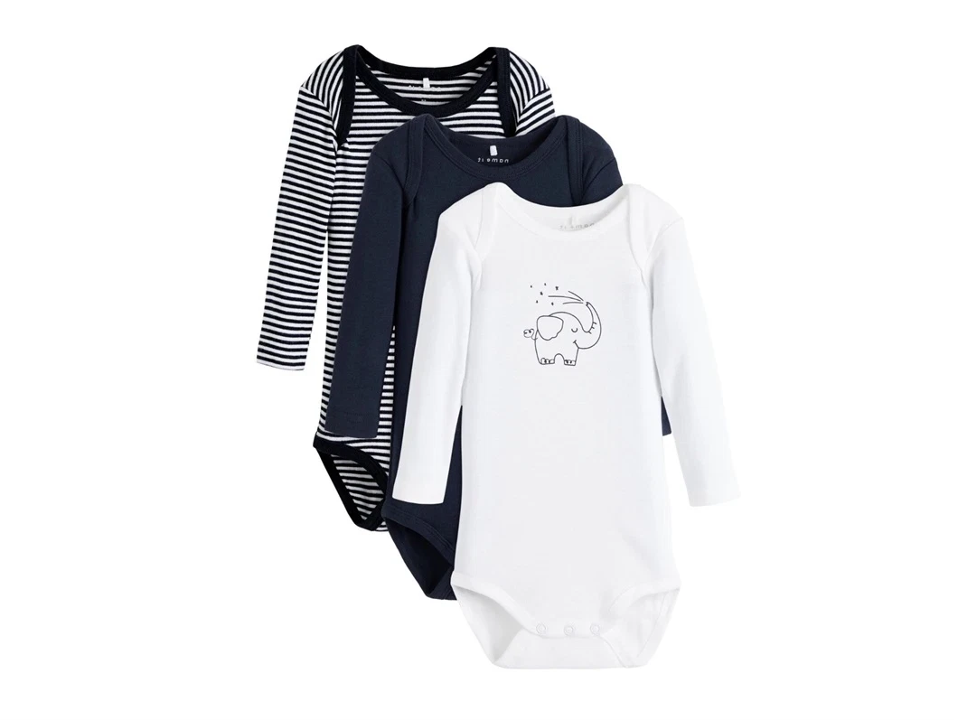 Pakken indeholder en ensfarvet body i farven dark sapphire, en hvid body med print af elefant og en stribet body.