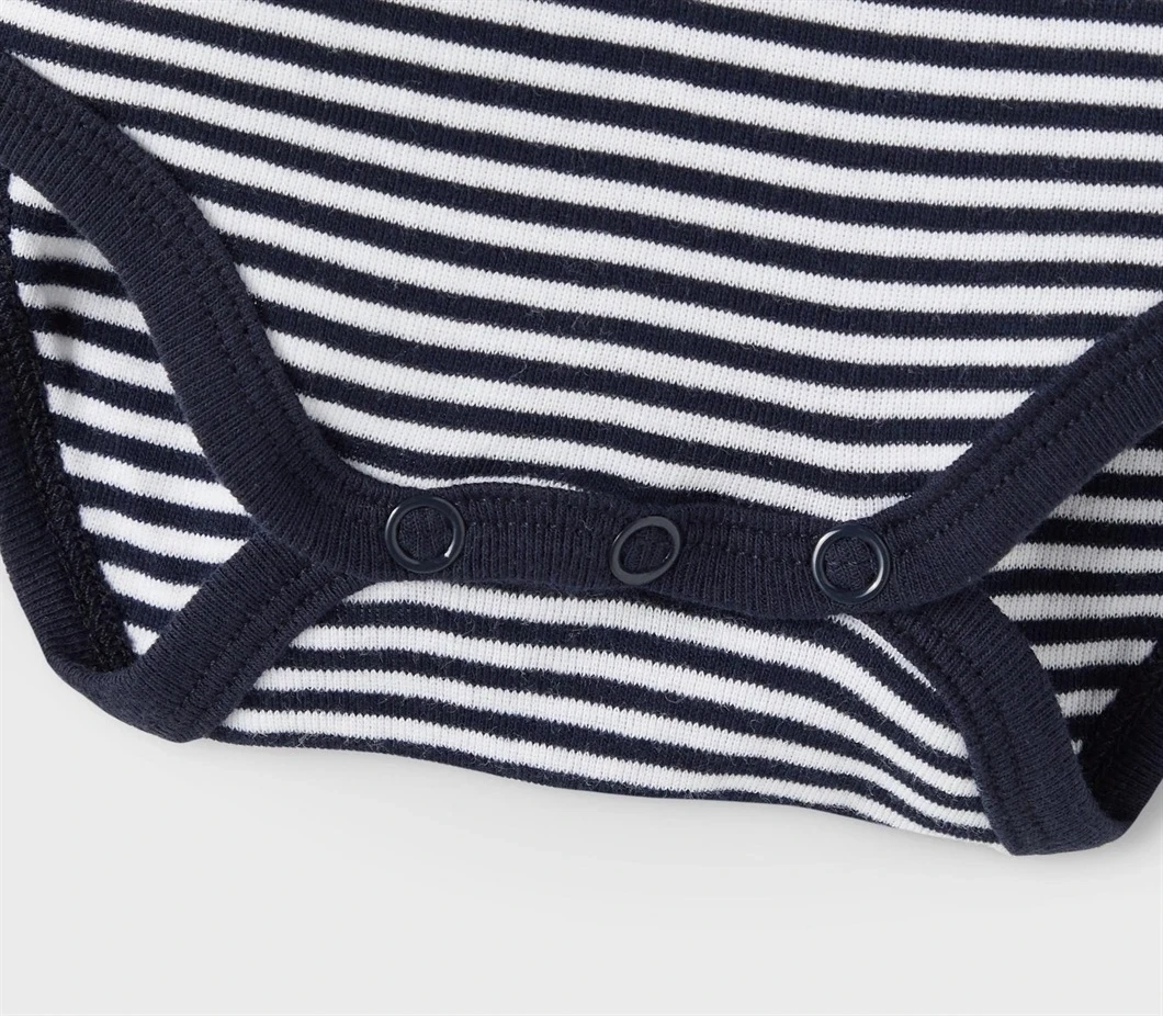 Pakken indeholder 1 ensfarvet body i farven dark sapphire, 1 hvid body med elefantprint og 1 stribet body.