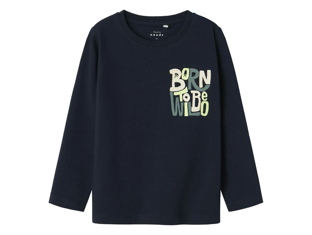 Langærmet top i farven dark sapphire med 'born to wild' print tema fra Name It.