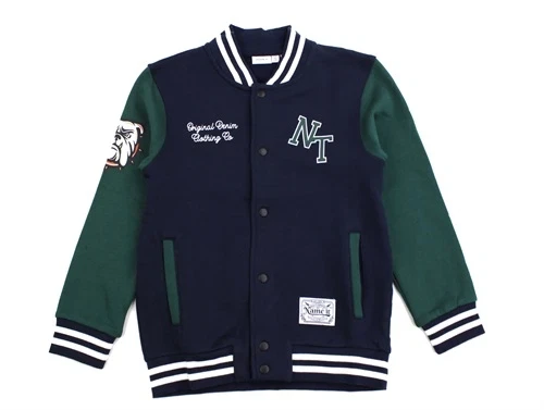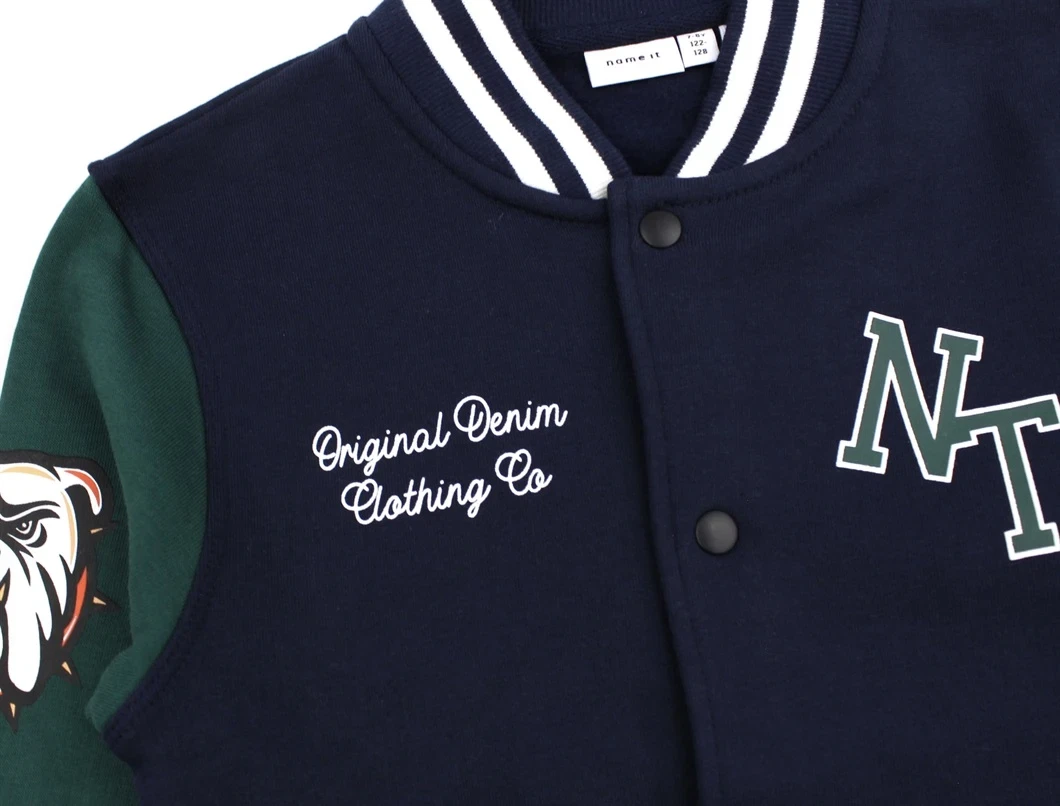 Sweatcardigan/jakke i farven dark sapphire med grønne og hvide detaljer fra Name It.