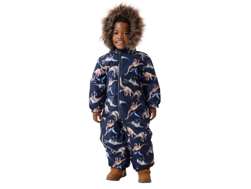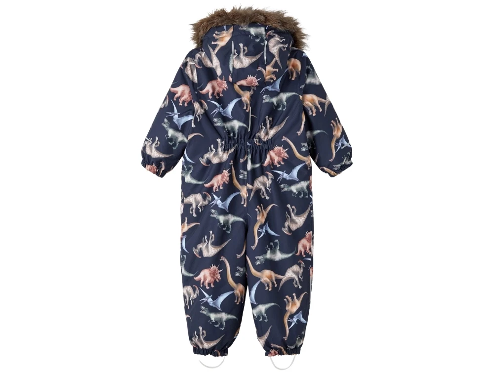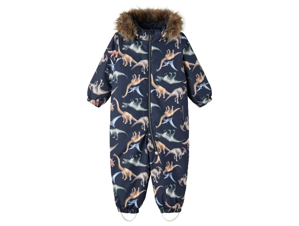 Flyverdragt i farven dark sapphire med dinoprint fra Name It. Flyverdragten har en aftagelig hætte med faux fur med trykknapper.