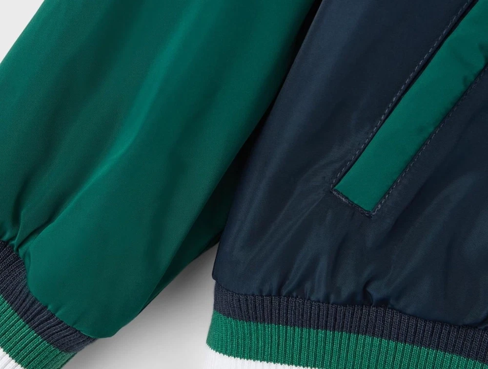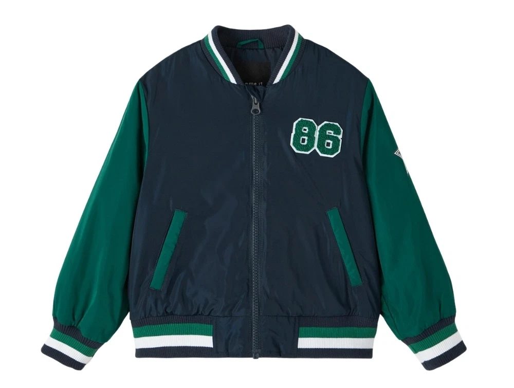 Sej college-look overgangsjakke i farven dark sapphire med grønne og hvide detaljer fra Name It.