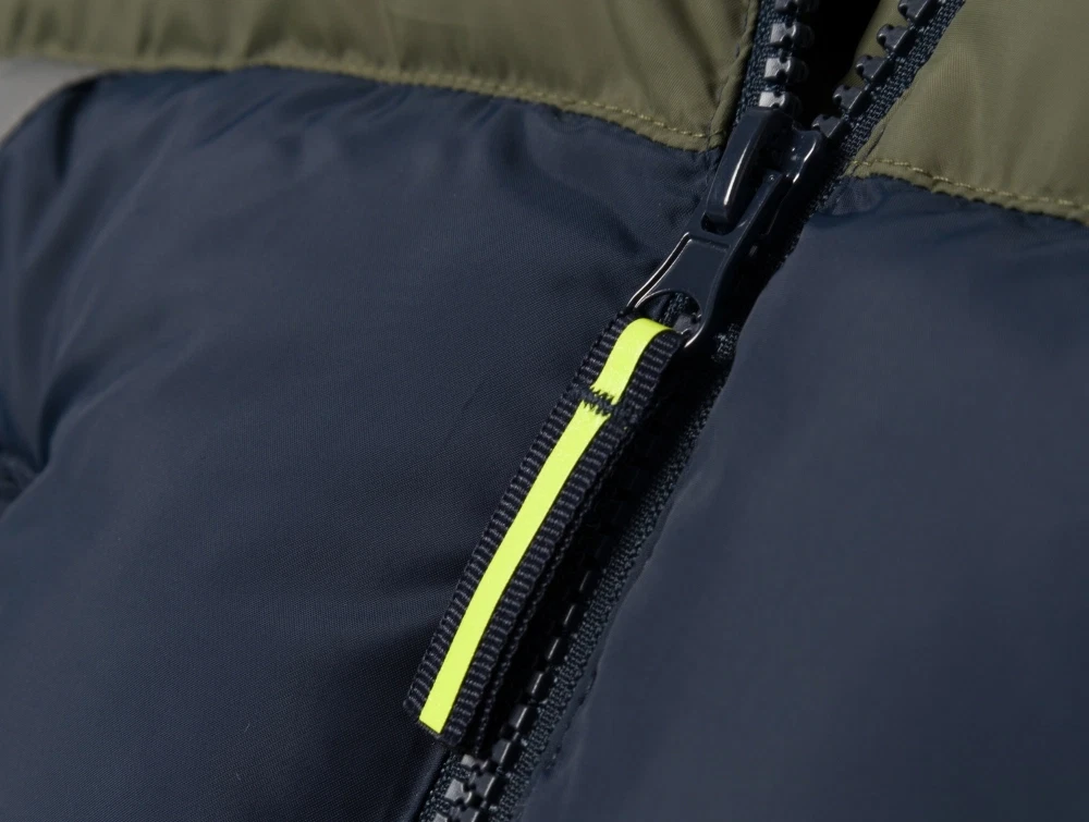 Jakken har to lommer og lukkes med lynlås. Det grå stof er reflekterende, som sikre bedre synlighed, når det er mørkt.