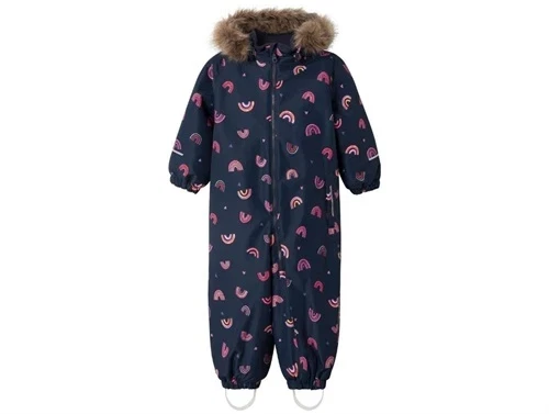 Flyverdragt i farven dark sapphire med regnbueprint fra Name It. Flyverdragten har en aftagelig hætte med faux fur med trykknapper.