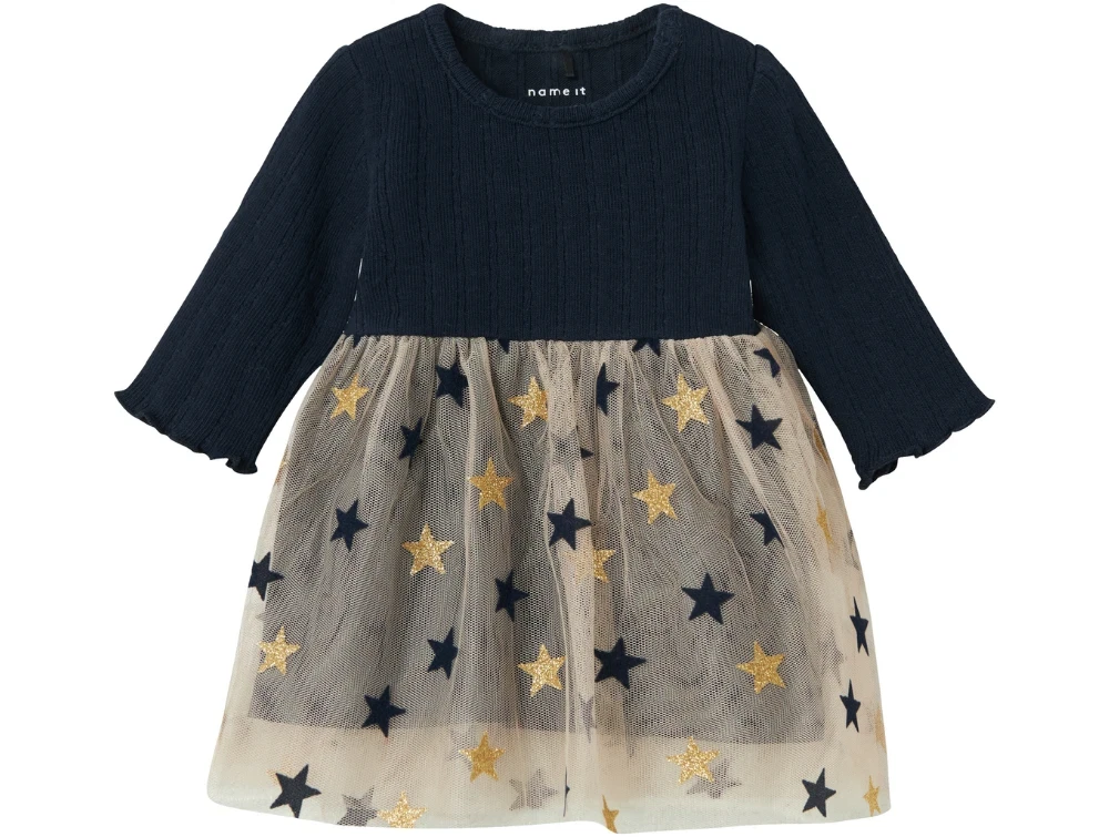 Babykjole i farven dark sapphire med tylskørt med stjerner fra Name It.