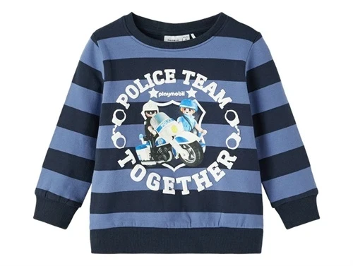 Sweatbluse i farven dark sapphire med striber og med Playmobil-print fra Name It.