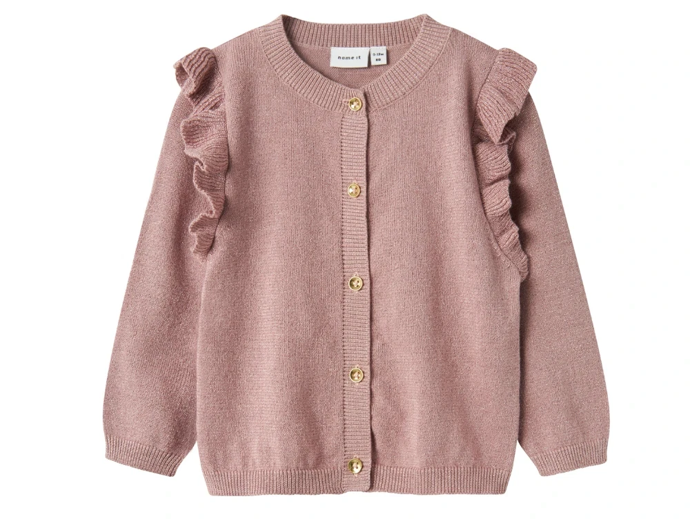 Cardigan i farven deauville mauve med flæser og glimmer fra Name It.