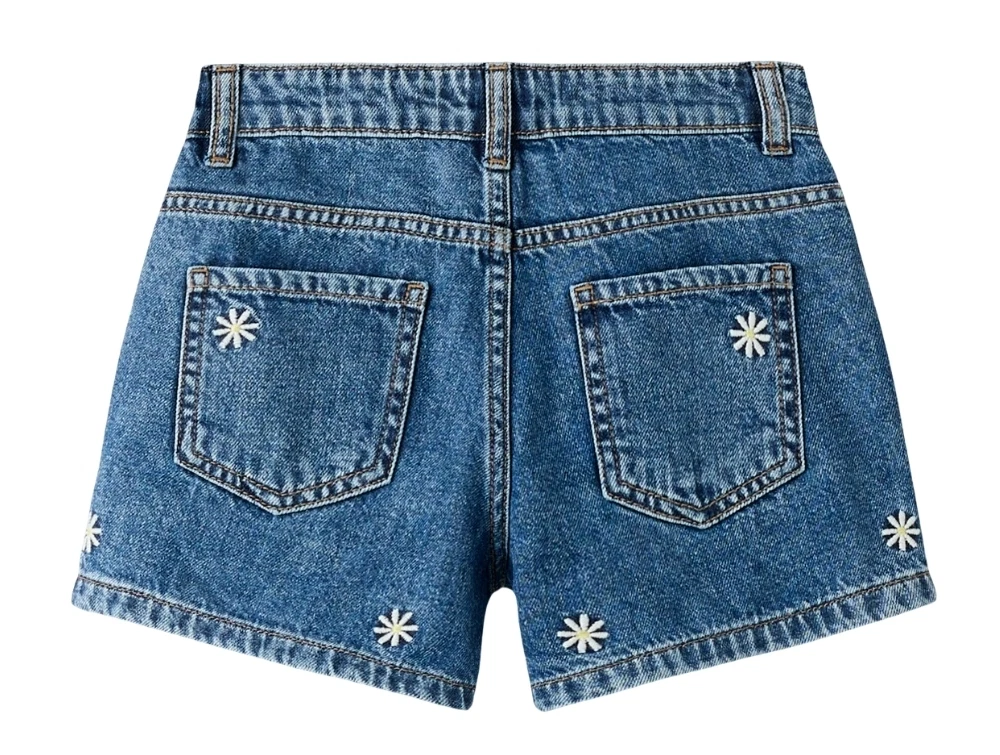 Shorts i blå denim nuance (medium blue denim daisy) fra Name It med små broderede blomster.