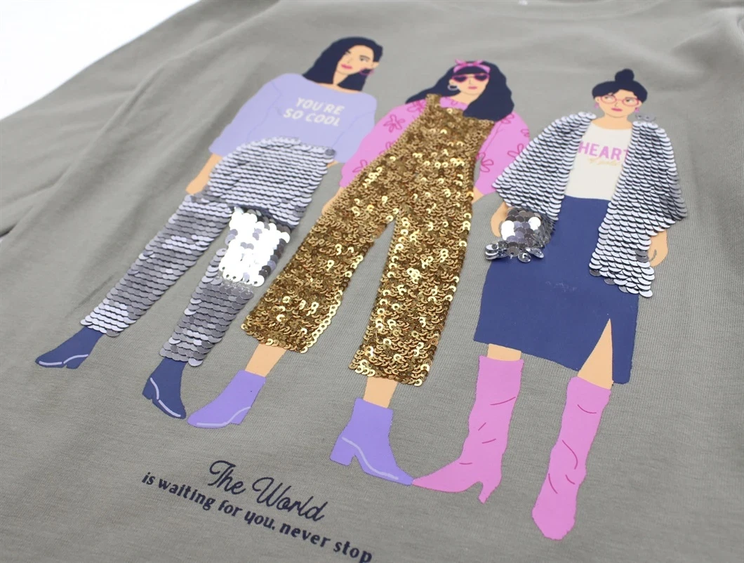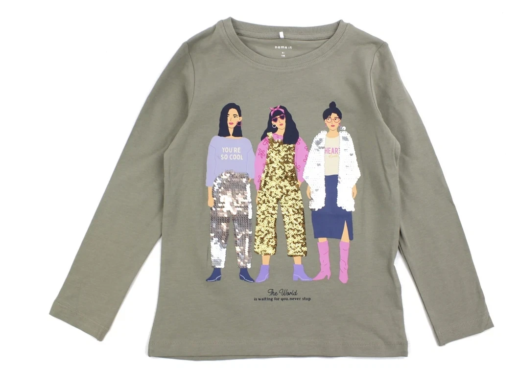 Langærmet top i farven dried sage med fashionprint og pailletter fra Name It.