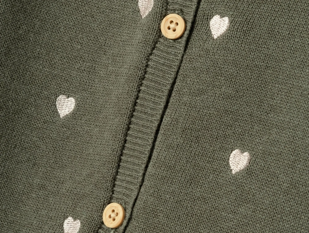 Cardigan i farven dusty olive med broderede hjerter fra Name It.