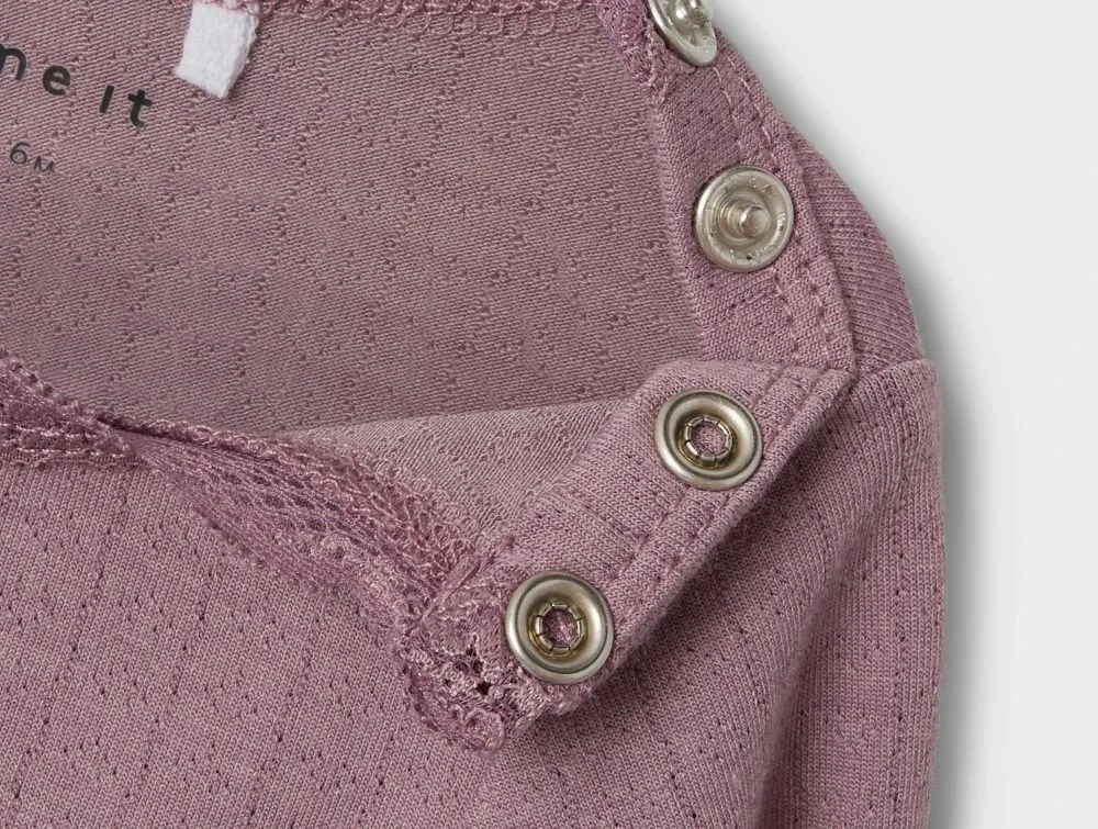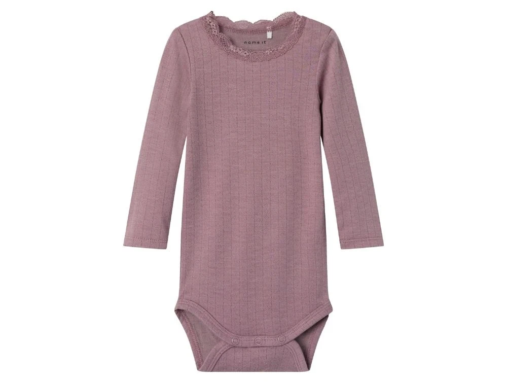 Body i farven elderberry med blondekant fra Name It. Den er lavet af 69% genanvendt polyester, 27% LENZING™ ECOVERO™ viskose og 4% elastan. Maskinvaskes ved 30° finvask.