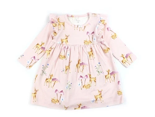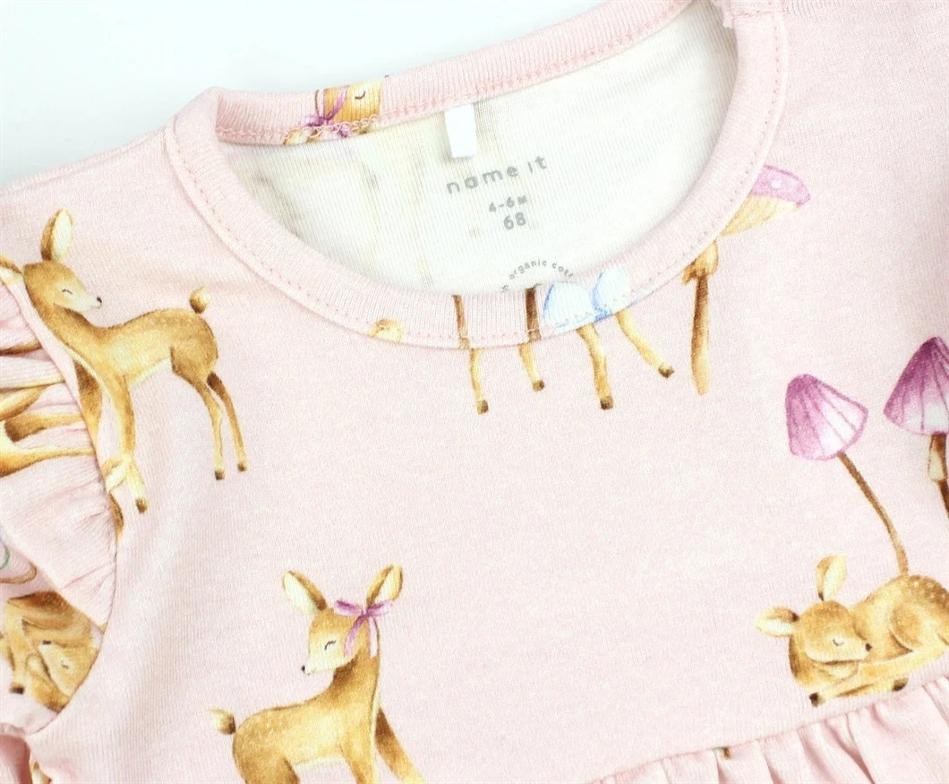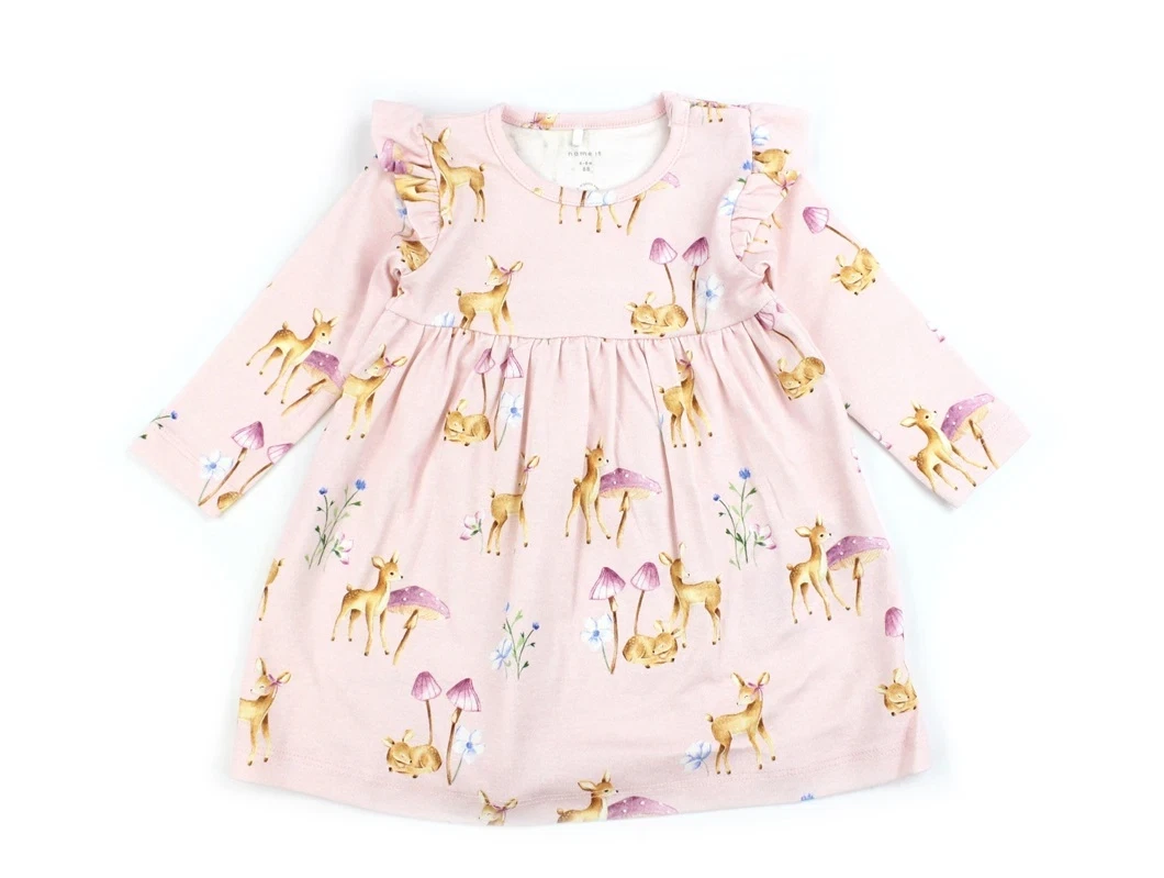 Kjole i farven festival bloom med sødt print af hjortekid fra Name It.