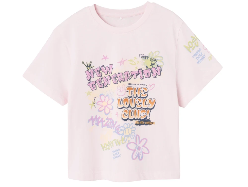 Løs og kort t-shirt i farven festival bloom med cool print fra Name It.