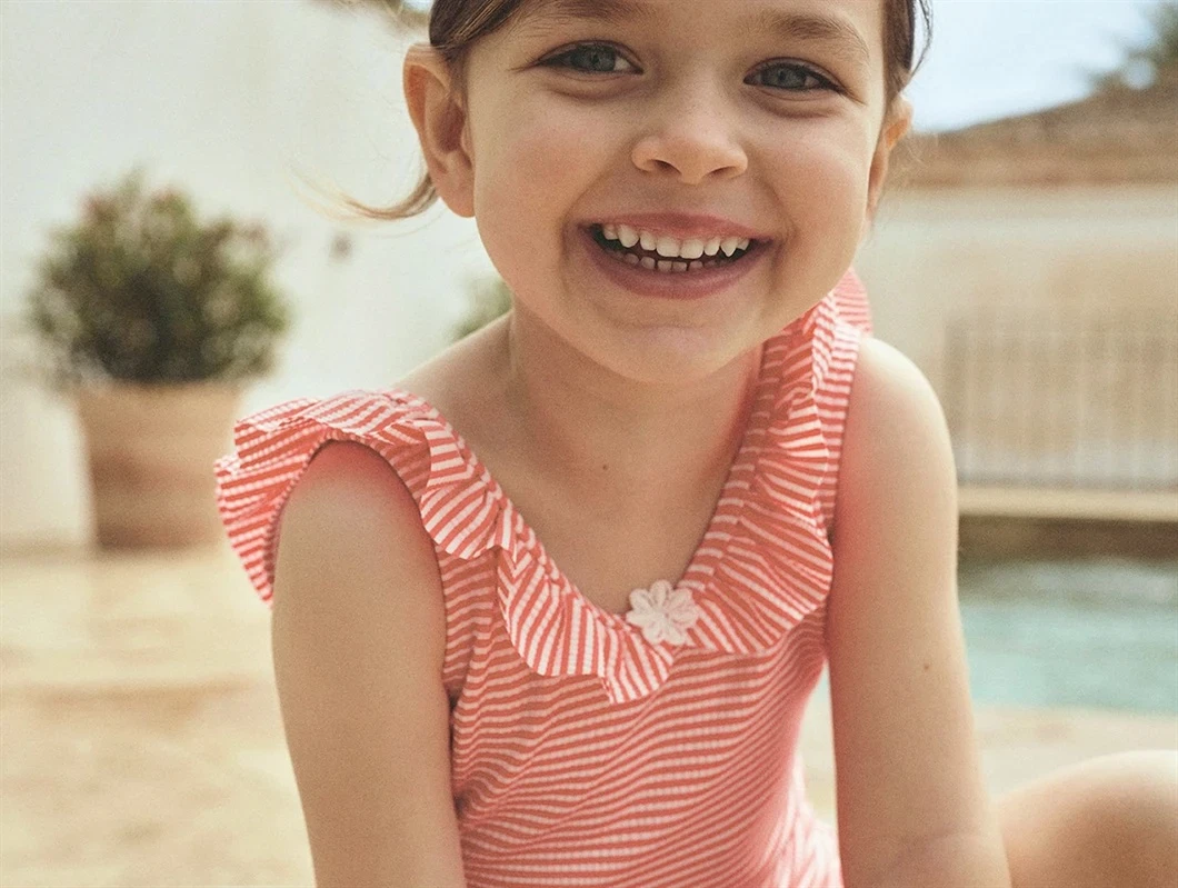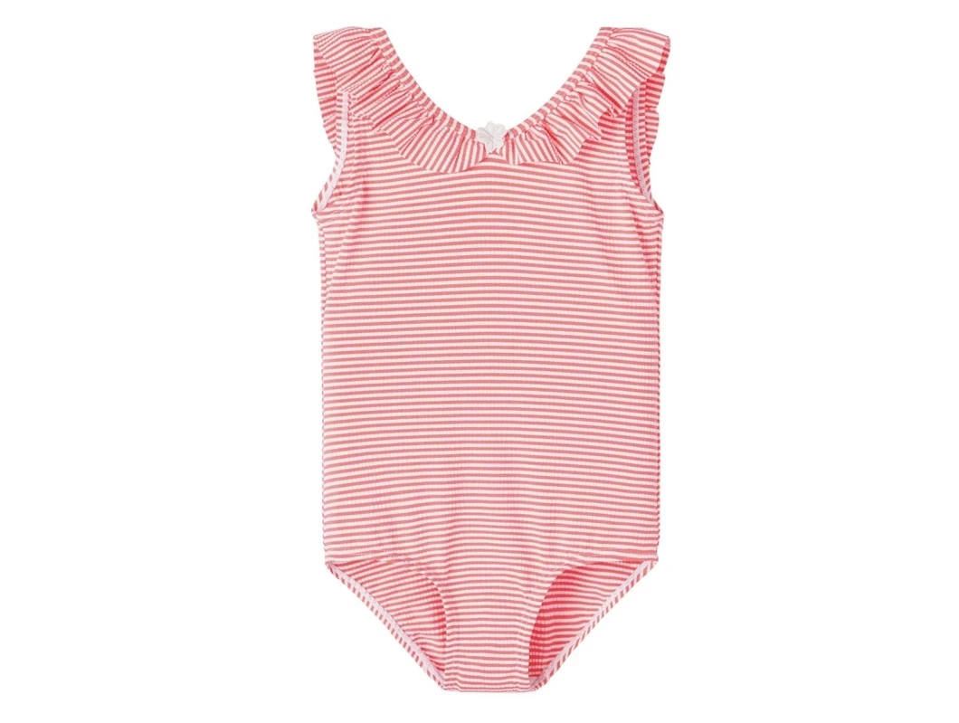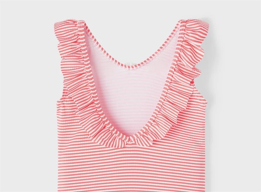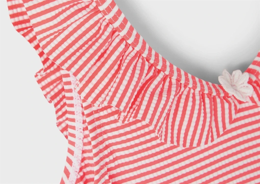 Badedragten kommer i farven fiery coral med flotte striber, feminine flæser og en lille sløjfe som en ekstra fin detalje.