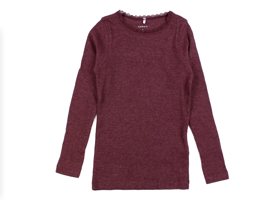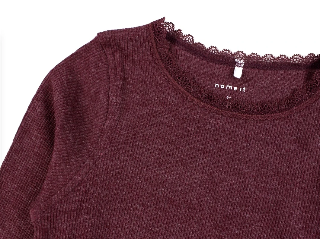 Langærmet top i farven fig melange med blonde ved halsåbning fra Name It.