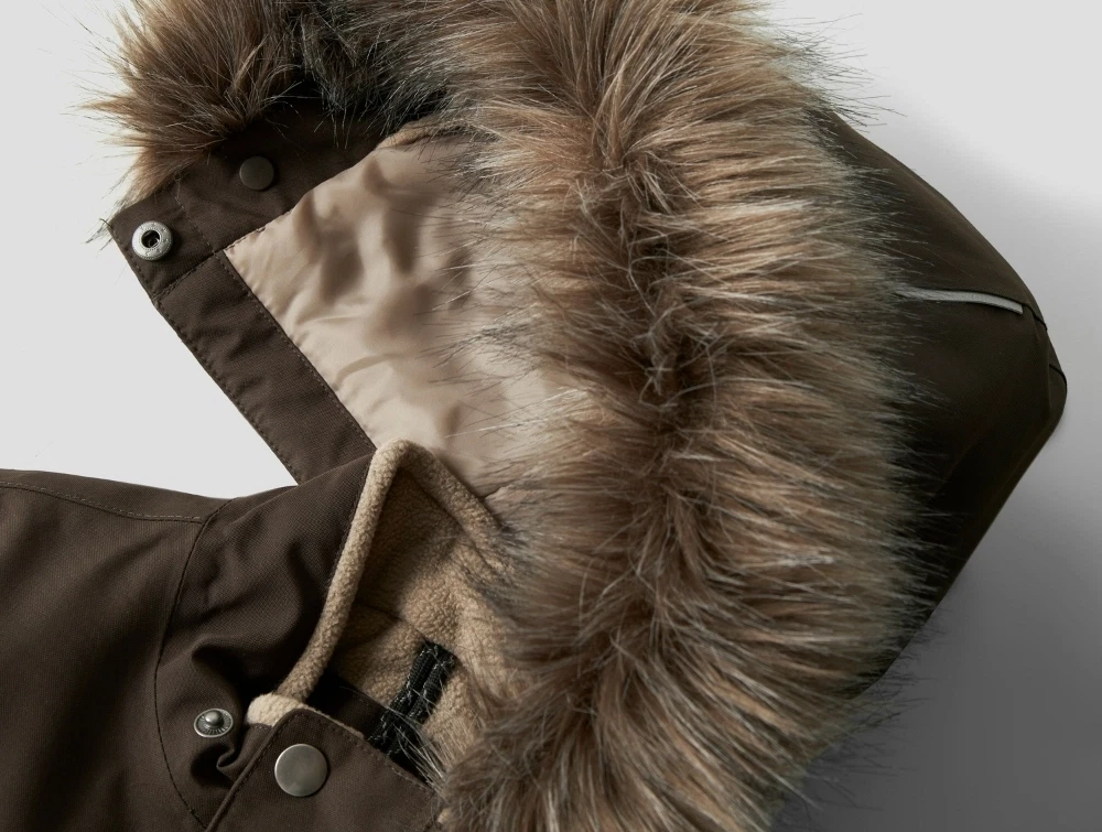 NAME IT brun flyverdragt med aftagelig hætte og pels forfraNAME IT brun flyverdragt med aftagelig hætte og pels bagfraNAME IT brun flyverdragt elastiske benåbninger og fodstropperNAME IT brun flyverdragt aftagelig hætte med pelskant