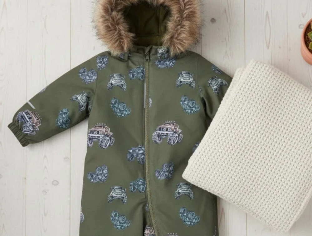 Flyverdragt i farven olive night med store 'truck'-biler fra Name It. Flyverdragten har en aftagelig hætte (med faux fur) med trykknapper.