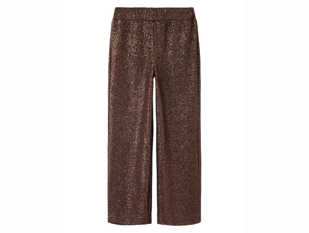 Name It glimmerbukser i hot fudge med elastik i taljenName It glimmerbukser i hot fudge set tæt på detaljeName It glimmerbukser i hot fudge set bagfra