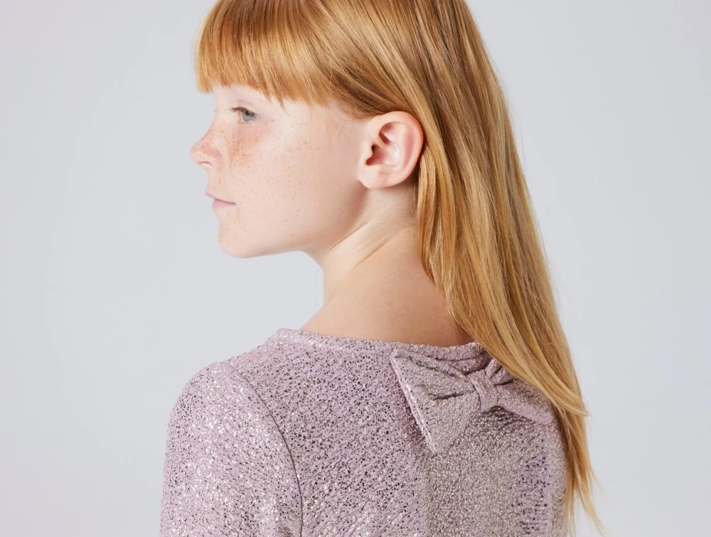 Name It glitterbluse i mauve mist med sløjfeName It glitterbluse i mauve mist på pigeName It glitterbluse i mauve mist set tæt på detaljeName It glitterbluse i mauve mist set bagfra