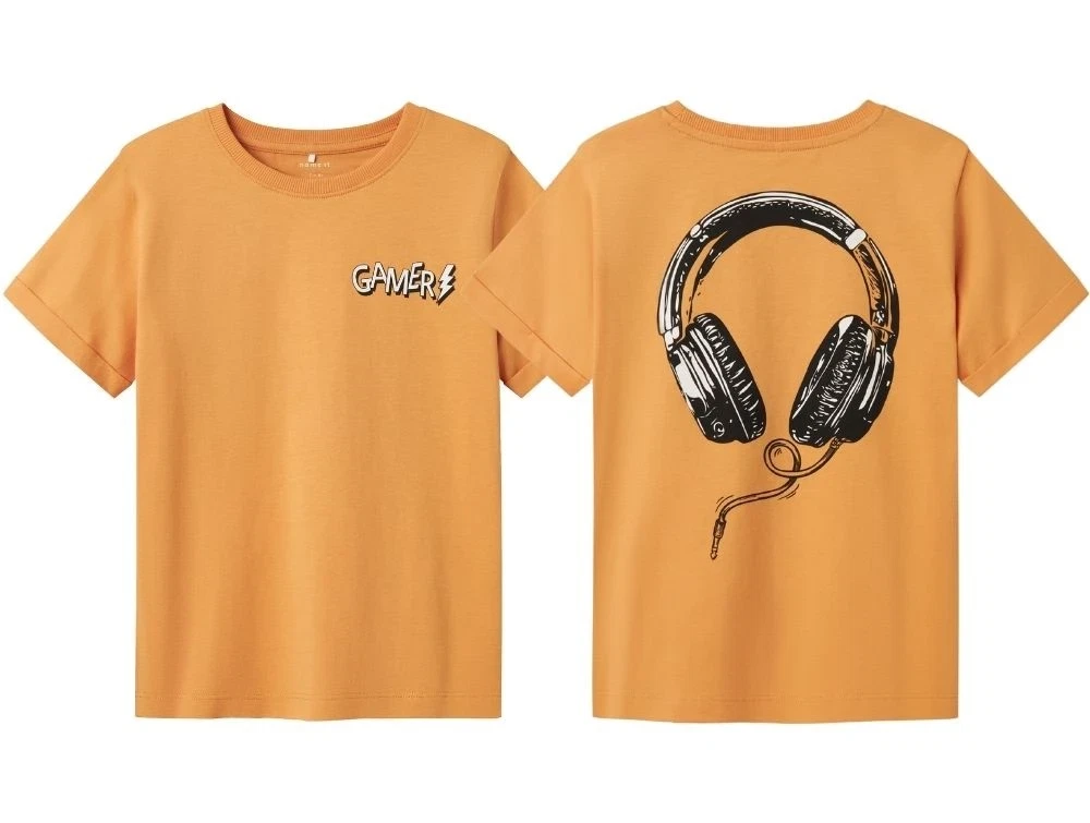Orange t-shirt fra Name It med cool gamerprint på både front og ryg.