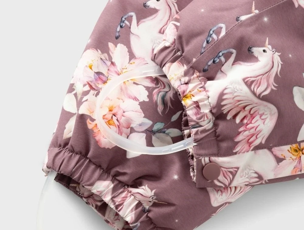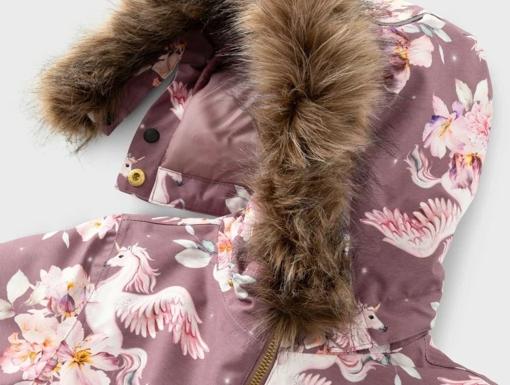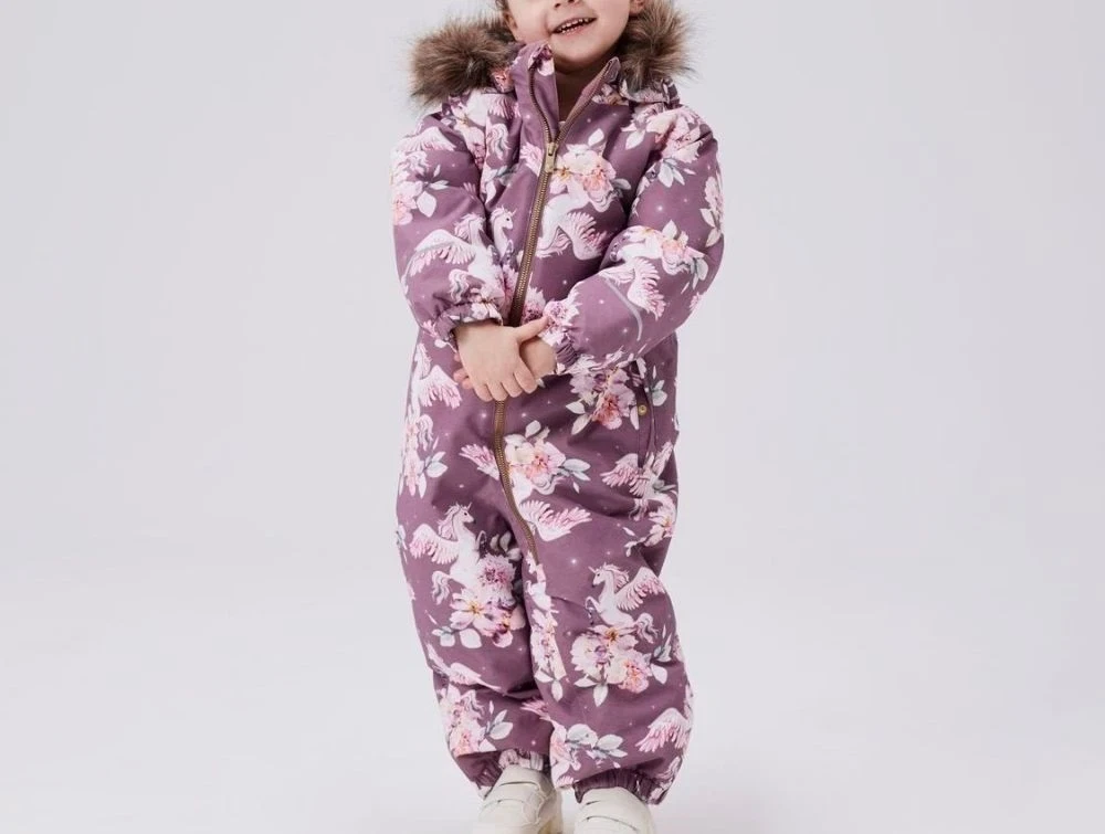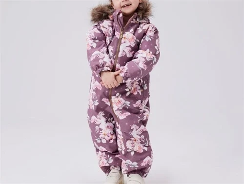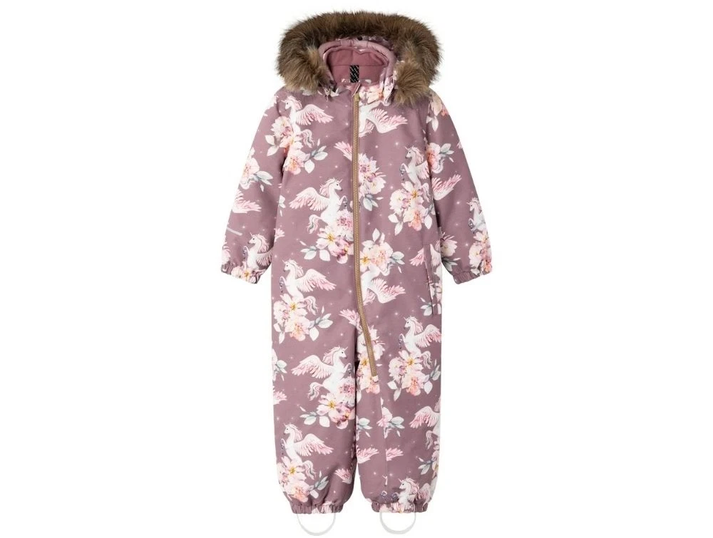 Flyverdragt i farven grape shake med enhjørning-print fra Name It. Flyverdragten har en aftagelig hætte med faux fur og trykknapper.
