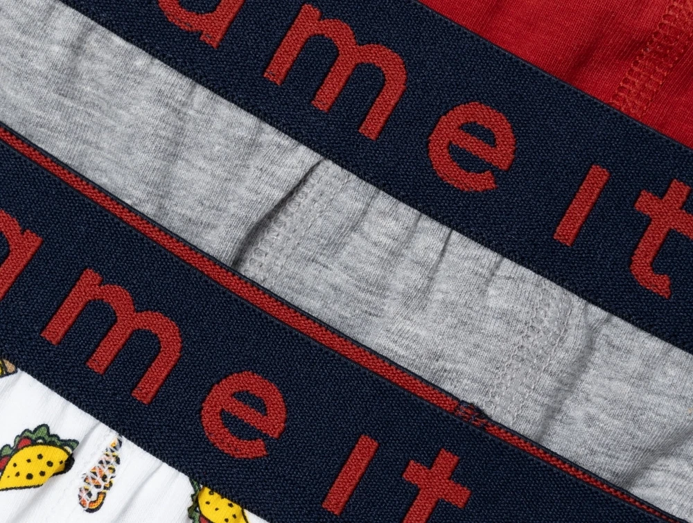 Pakken indeholder 1 par ensfarvede røde, 1 par ensfarvede grå og 1 par grå boxershorts med pizza, taco og burgerprint.