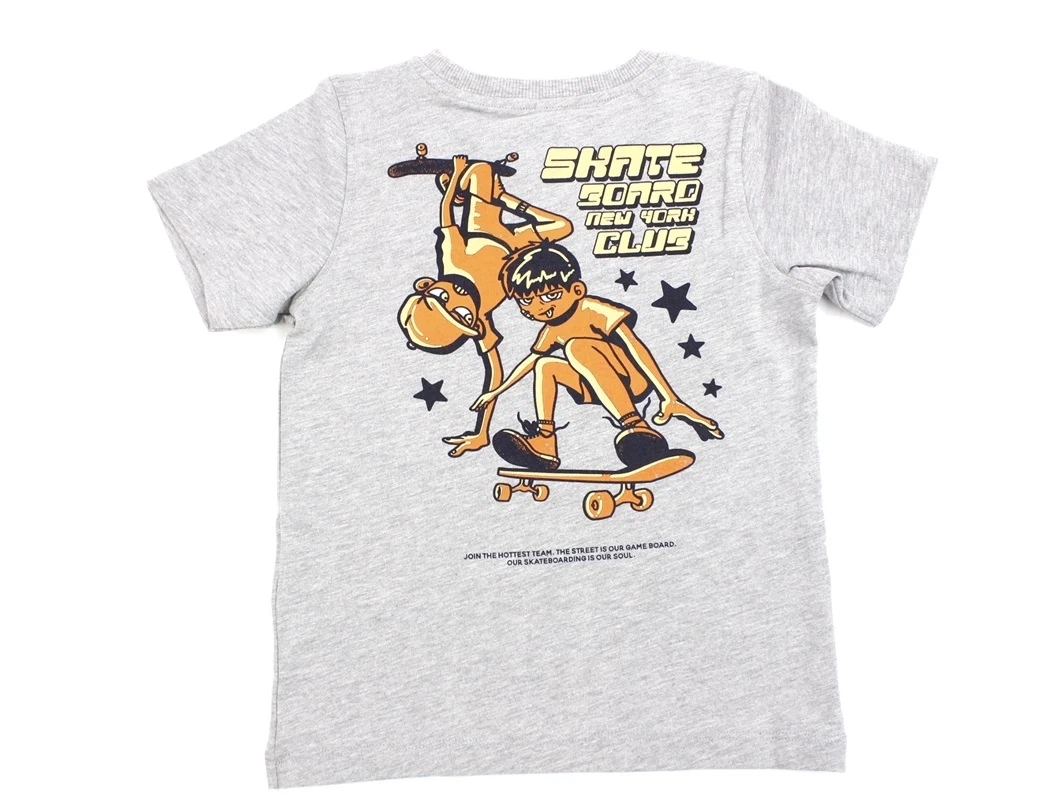 Kortærmet cool t-shirt i farven grey melange med skateboard print både foran og bagpå fra Name It.