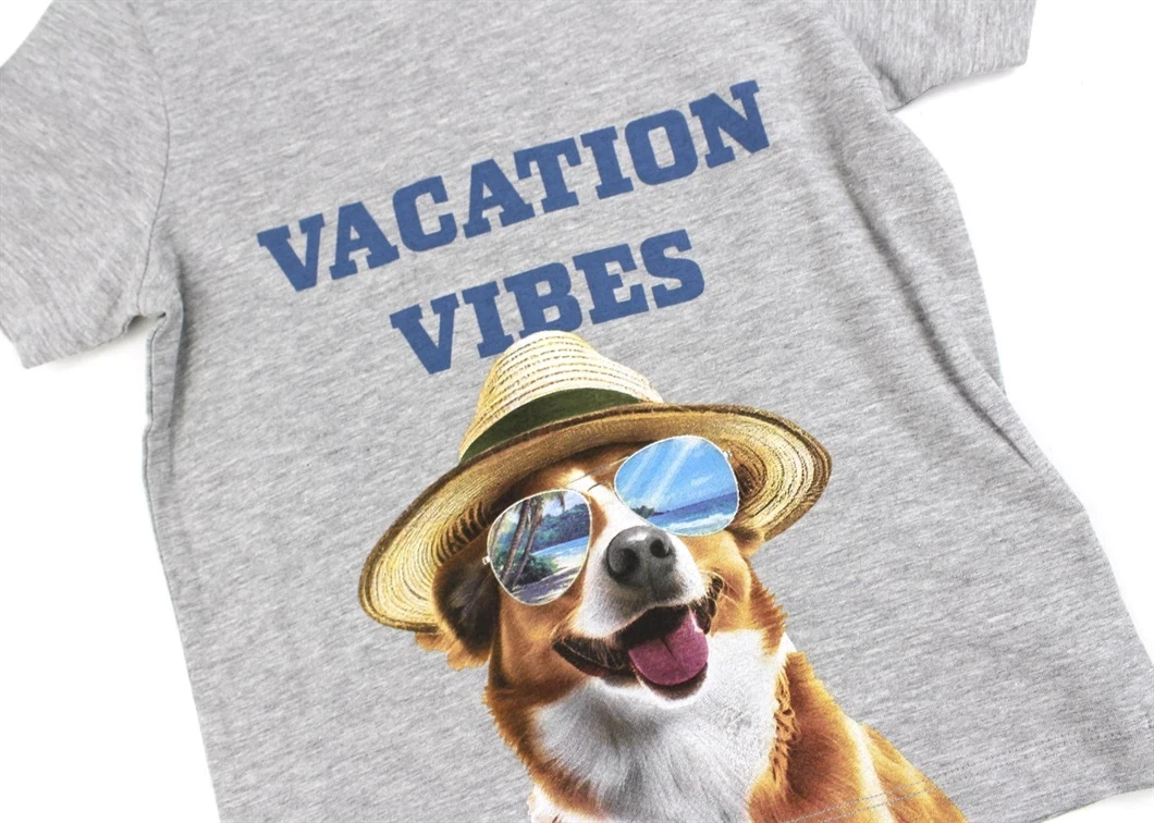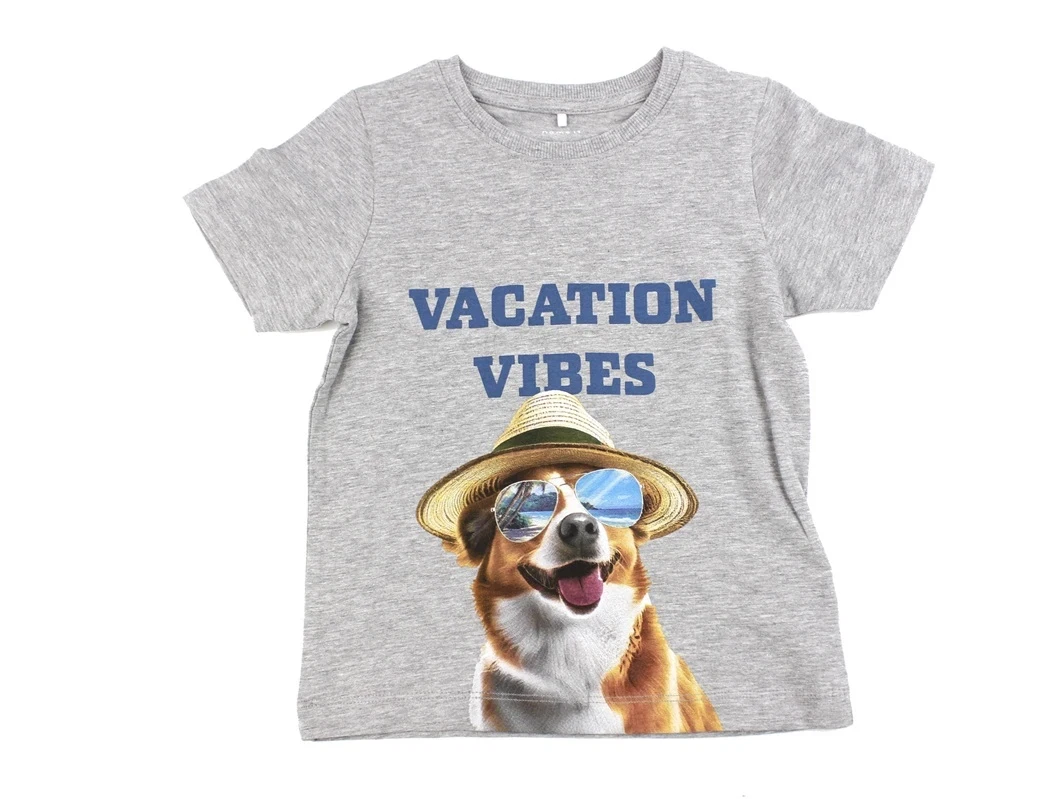 T-shirt med i farven grey melange med vacation vibes hundeprint fra Name It.