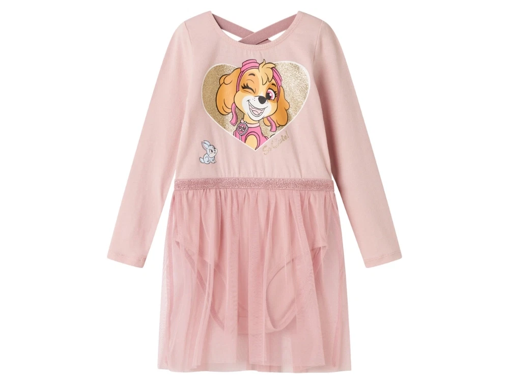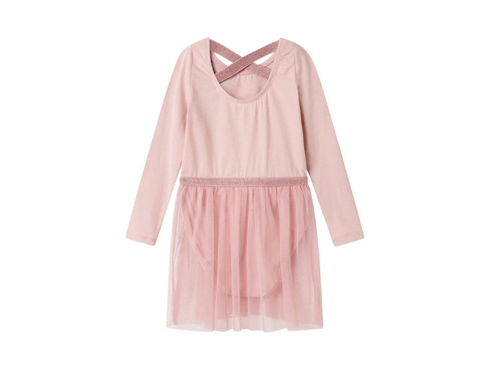 Sød gymnastikdragt i rosa nuance (burnished lilac) fra Name It med motiv af Skye fra Paw Patrol. Dragten har lange ærmer, rund hals og et fint tylskørt med glimmerelastik i taljen, som giver et sødt ballerina-look.