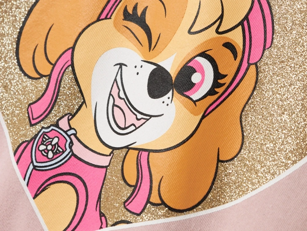 Den bløde bomuldsblanding og strækbare kvalitet gør dragten behagelig at bevæge sig i. Glitterprintet foran viser Skye fra Paw Patrol omgivet af et hjerte, der glitrer smukt i lyset. En yndig model til små Paw Patrol-fans, der elsker at danse og lege.