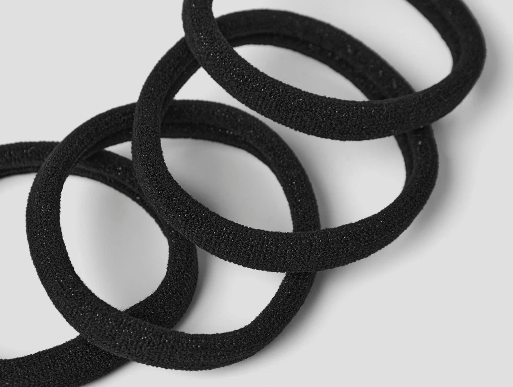 Sættet består af fire elastikker med glimmertråde, der giver et fint og diskret skær i håret.
