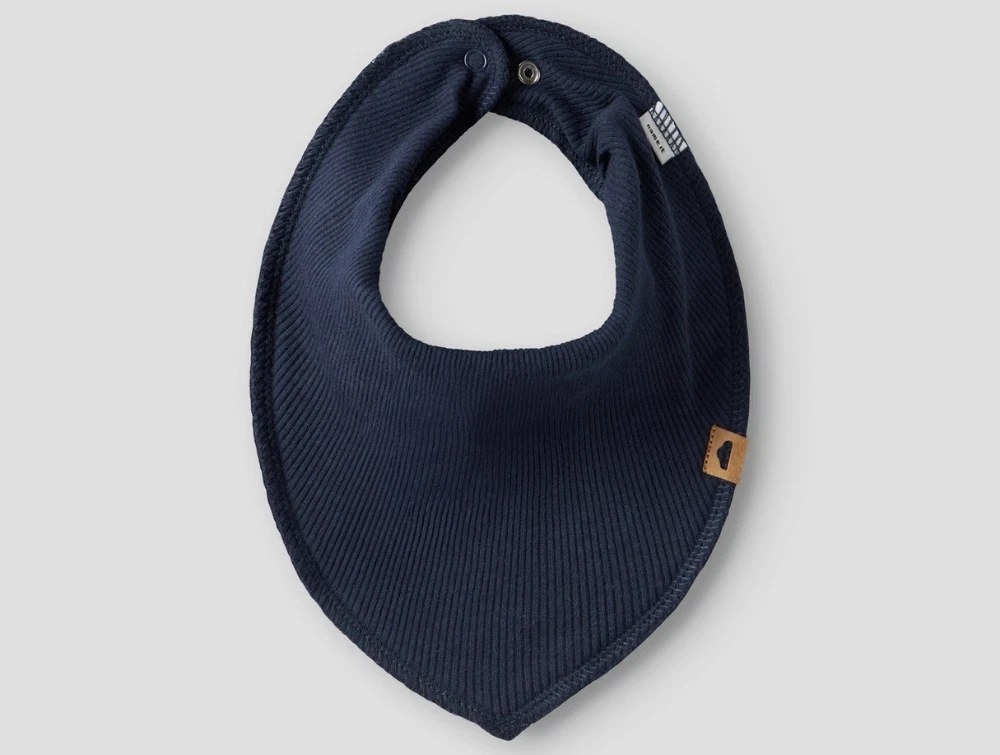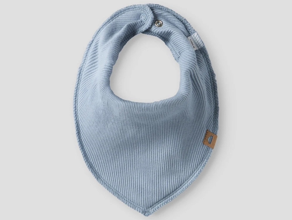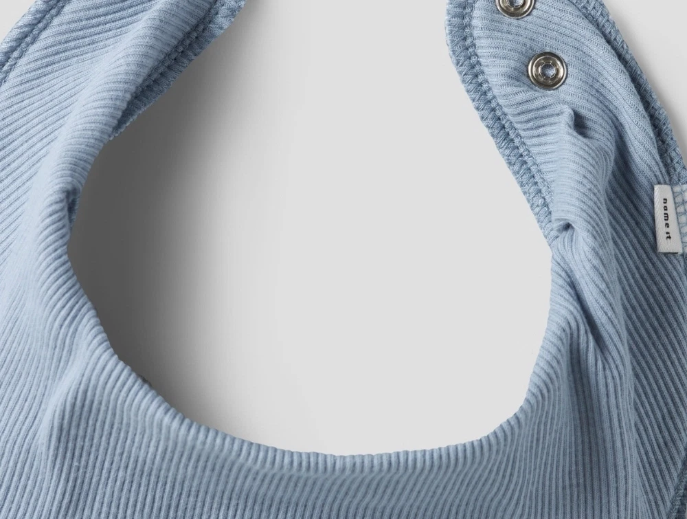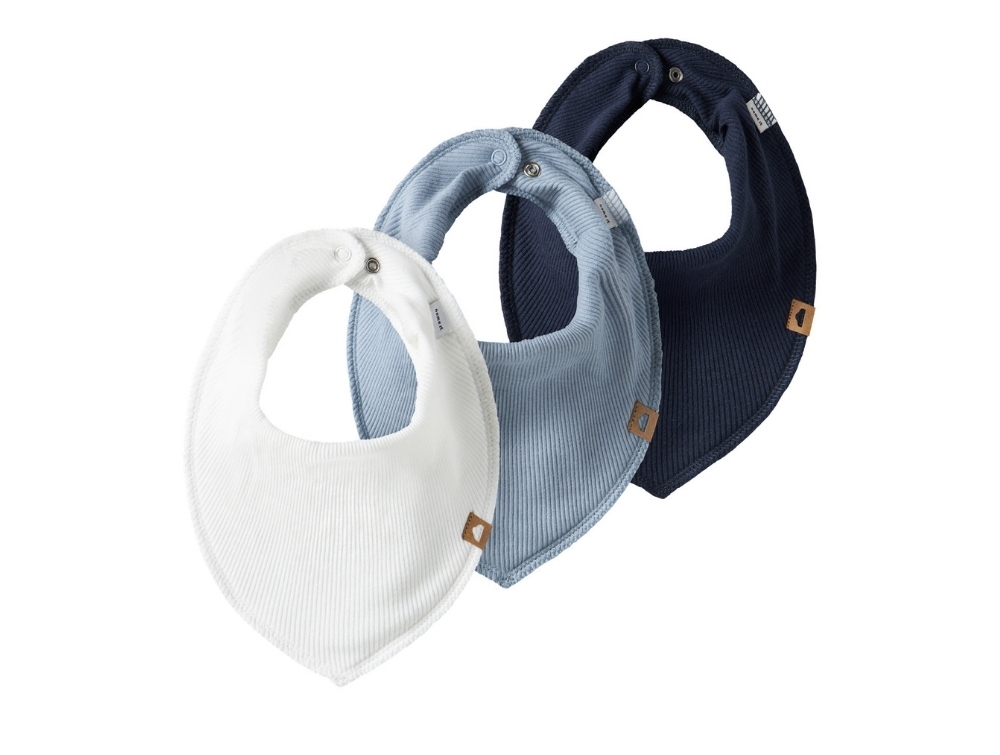 3-pak hagesmække i bløde ribstrikkede materialer fra Name It. Sættet består af tre farver – hvid, lyseblå og navy. Hver hagesmæk har trykknaplukning i nakken og et lille mærke foran. Perfekte til at beskytte tøjet under måltider og ved savl.
