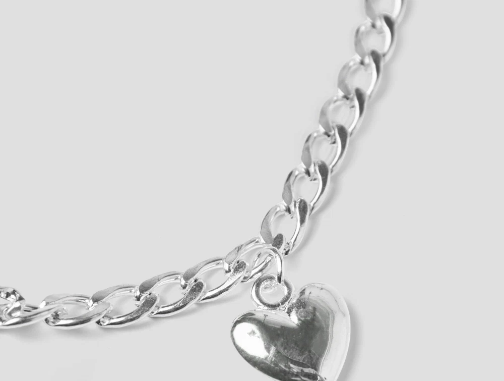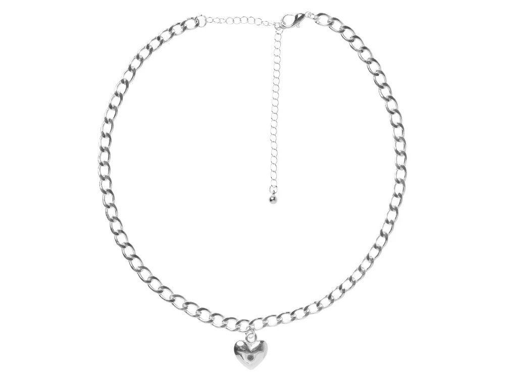 Halskæden har et enkelt og klassisk udtryk med kæde og et lille hjertevedhæng i midten.