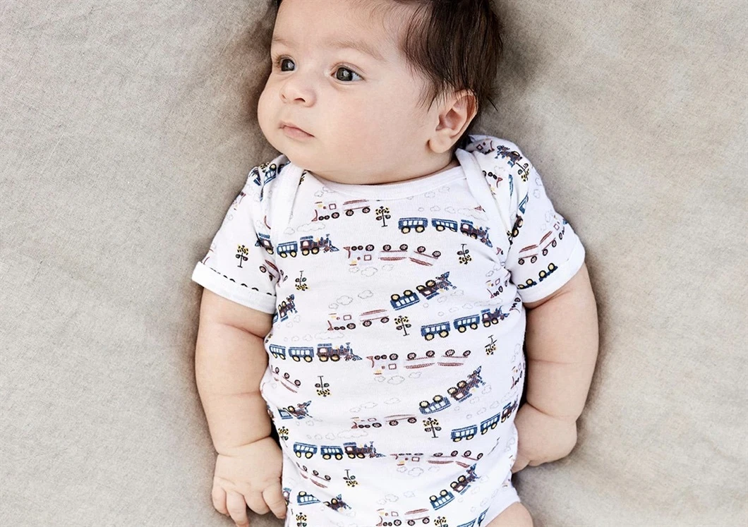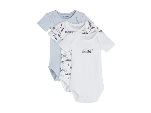 Pakken indeholder 1 ensfarvet blå body, 1 hvid body med togprint og 1 hvid body med all-over togprint.